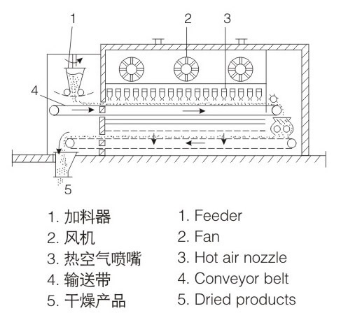 該機是穿流連續(xù)式干燥設備,用于透氣性好的片狀、條狀、顆粒狀物料的干燥,對于脫水蔬菜,中藥飲片等含水率高,而溫度不允許高的物料尤為合適;該系列干燥機具有干燥速度快、蒸發(fā)強度高、產品質量好的優(yōu)點。對脫水濾餅狀的膏狀物料,需經(jīng)造?;蛑瞥砂魻詈笠嗫筛稍?。