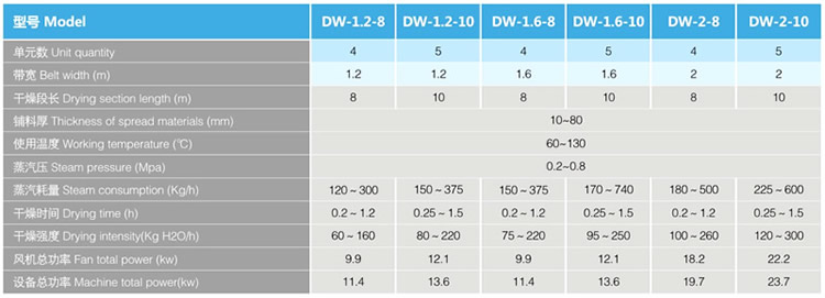 物料由加料器均勻地鋪在網(wǎng)帶上,網(wǎng)帶一般采用12—60目不銹鋼絲網(wǎng),由傳動(dòng)裝置拖動(dòng)在干燥機(jī)內(nèi)移動(dòng)。干燥機(jī)由若干單位組成,每一單元熱風(fēng)獨(dú)立循環(huán),部分尾氣由專門排濕風(fēng)機(jī)排出,廢氣由調(diào)節(jié)閥控制,熱氣由下往上或由上往下穿過鋪滿物料的網(wǎng)帶完成熱量與質(zhì)量傳遞的進(jìn)程,帶走物料水份。網(wǎng)帶緩慢移動(dòng),運(yùn)行速度可根據(jù)物料溫度自由調(diào)節(jié),干燥后的成品連續(xù)落入收料器中。上下循環(huán)單元根據(jù)用戶需要可靈活配備,單元數(shù)量可根據(jù)需要選取。技術(shù)參數(shù)