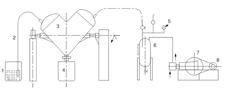 1.物料筒 2.吸料筒 3.混合機 4.出料筒 5.真空表 6.氣體凈化罐 7.真空泵 8.電動機