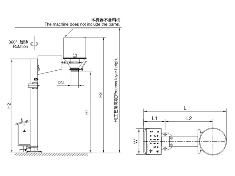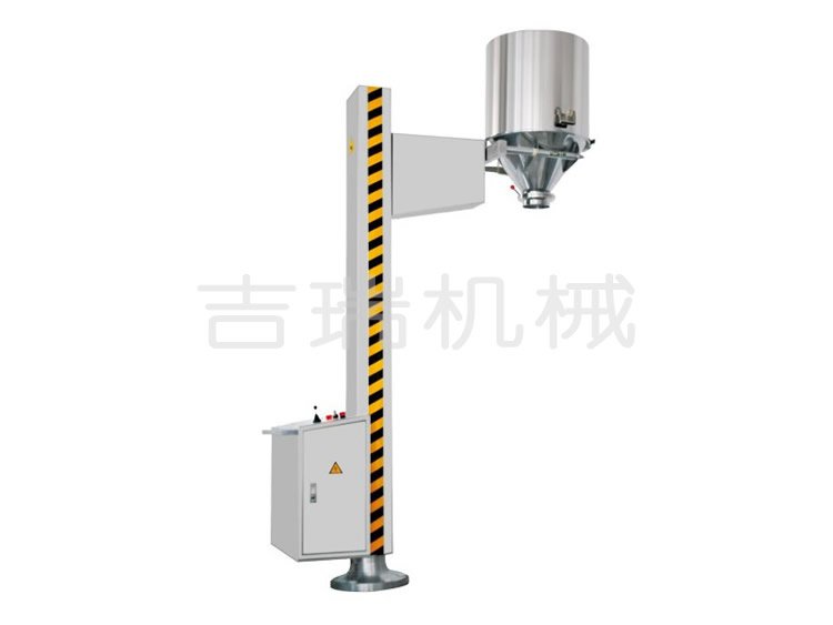 該機主要由底盤、立柱、提升系統(tǒng)、翻轉系統(tǒng)等組成。工作時,先將錐斗與料桶扣合,然后啟動提升按鈕,料桶提升;啟動翻轉按鈕,料桶即可翻轉180°。旋轉立柱與加料的設備密閉對接,開啟出料蝶閥,使物料密閉轉移到下一工序。特點